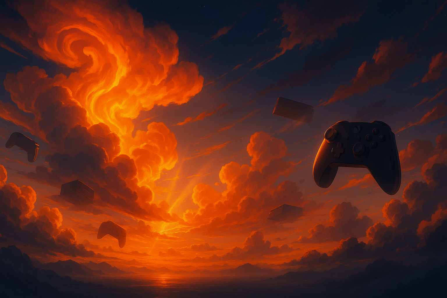 - Banner: A cinematic 4K artwork inspired by One Piece’s sky — controllers and consoles drifting through radiant clouds.